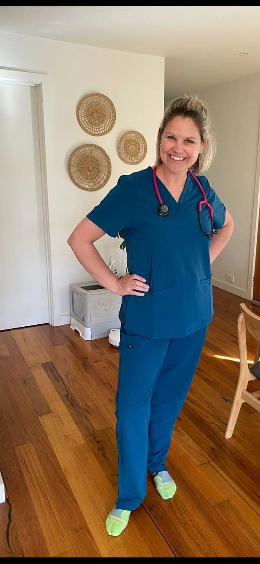 Doctor demonstrating the fit of Dr. Woof Scrubs