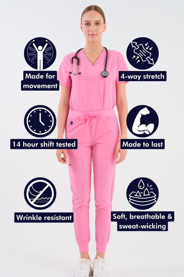 Classic jogger style scrub pants with an elastic waistband and adjustable drawstring.