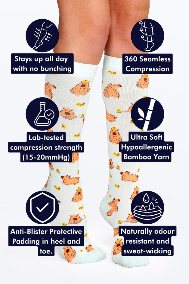 Our Capybara Compression Socks combine the comfort and luxury of bamboo fabric with 360° seamless compression.