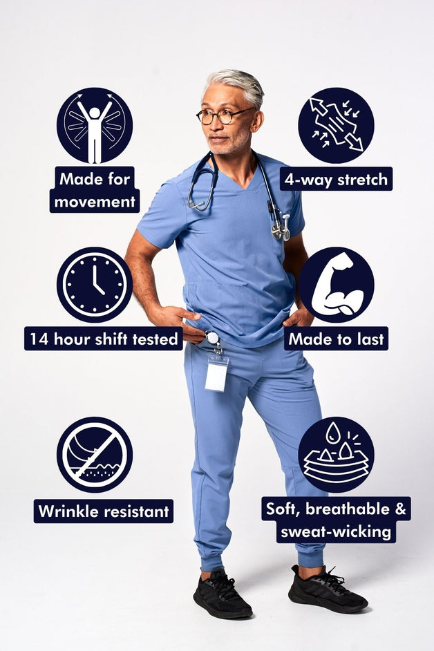Classic jogger style scrub pants with an elastic waistband and adjustable drawstring.