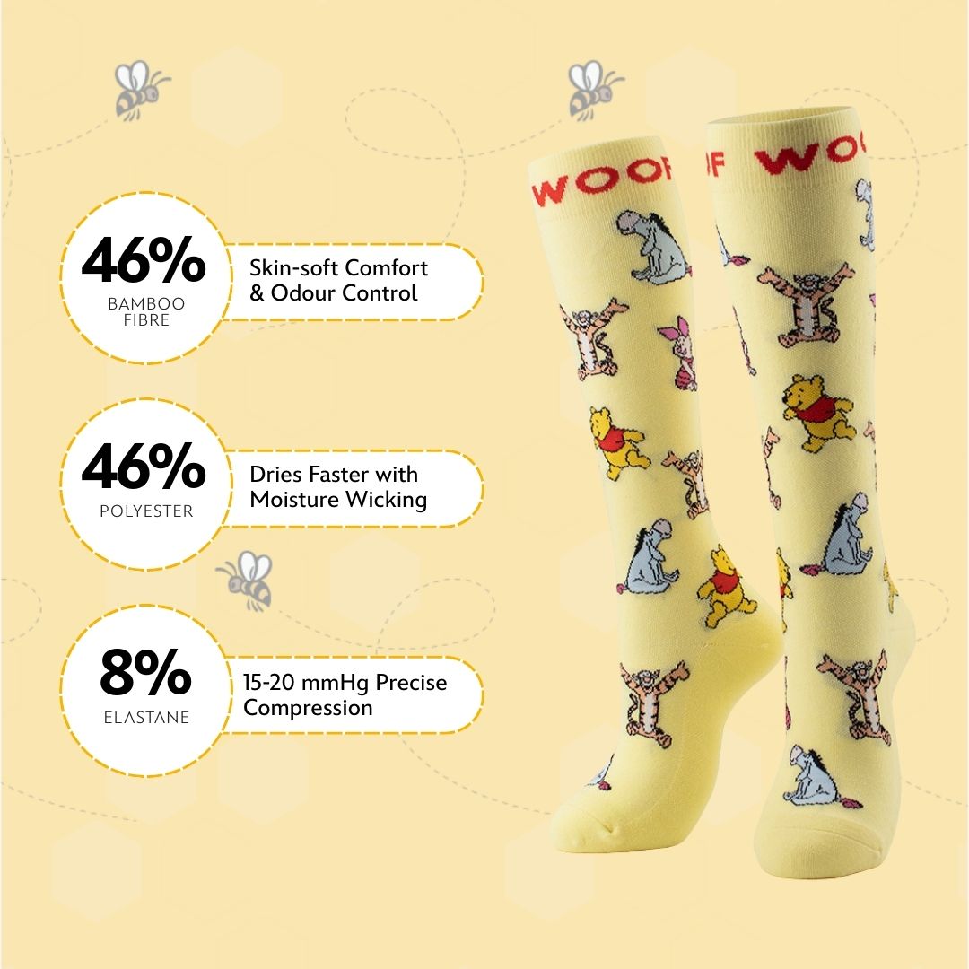 Featuring Disney’s Winnie the Pooh, these compression socks combine the comfort and luxury of bamboo fabric with 360° seamless compression.