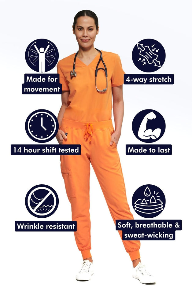 Classic jogger style scrub pants with an elastic waistband and adjustable drawstring.