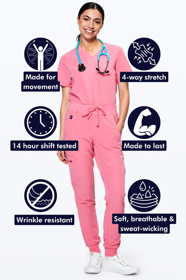 Classic jogger style scrub pants with an elastic waistband and adjustable drawstring.