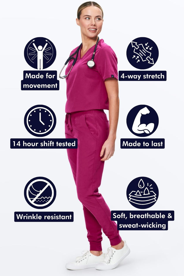 Classic jogger style scrub pants with an elastic waistband and adjustable drawstring.