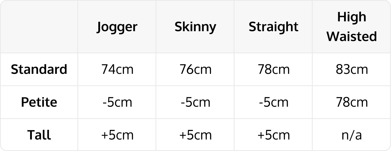 | (cm) | Jogger | Skinny | Straight |